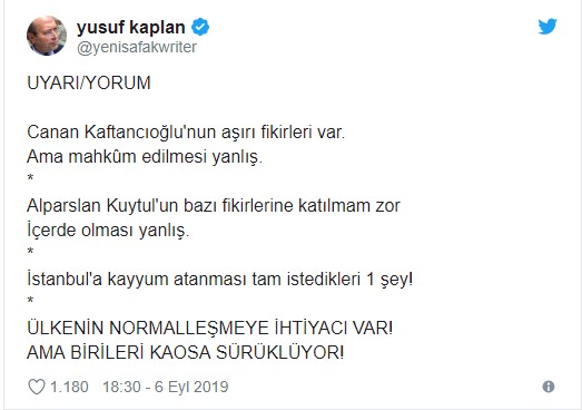 Yeni Şafak yazarı Yusuf Kaplan, sosyal medyadan skandal paylaşımları nedeniyle 5 ayrı suçtan toplamda 9 yıl 8 ay 20 gün hapis cezasına çarptırılan CHP İstanbul İl Başkanı Canan Kaftancıoğlu ve İstanbul için gündeme gelen kayyım konusuna ilişkin konuştu.