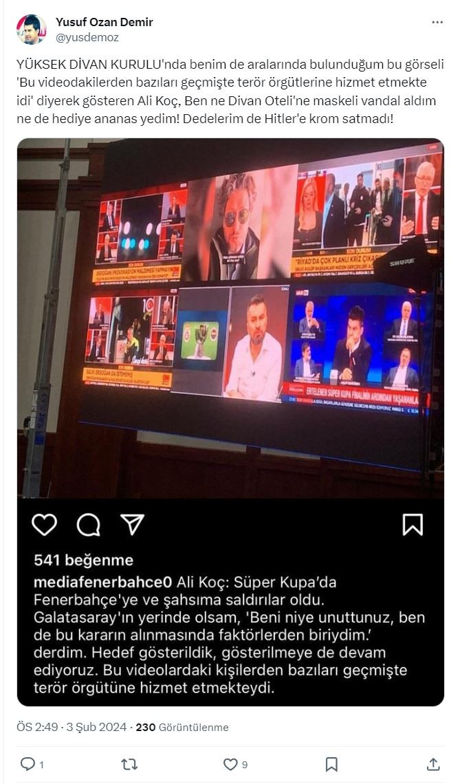 Demir, sosyal medya platformu Twitter üzerinden Koç'a verdiği cevapta, "Yüksek Divan Kurulu'nda benim de aralarında bulunduğum bu görseli 'Bu videodakilerden bazıları geçmişte terör örgütlerine hizmet etmekte idi' diyerek gösteren Ali Koç, Ben ne Divan Oteli'ne maskeli vandal aldım ne de hediye ananas yedim! Dedelerim de Hitler'e krom satmadı!" ifadelerini kullandı.