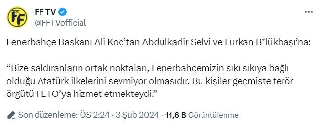 Ali Koç'un paylaştığı görsele düşülen notta, “Bize saldıranların ortak noktaları, Fenerbahçemizin sıkı sıkıya bağlı olduğu Atatürk ilkelerini sevmiyor olmasıdır. Bu kişiler geçmişte terör örgütü FETÖ’ya hizmet etmekteydi.” ifadeleri yer aldı.