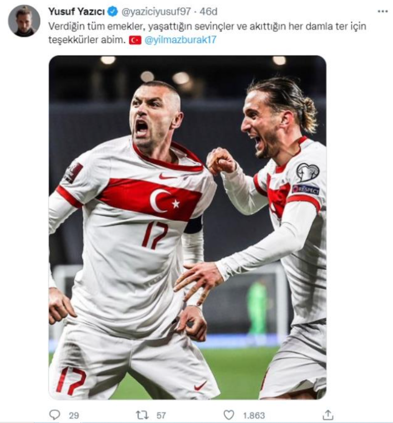 2022 Dünya Kupası Avrupa Elemeleri play-off turu yarı final maçında Portekiz'e 3-1 kaybettiğimiz mücadelenin ardından A Milli Takım'ı bıraktığını açıklayan Burak Yılmaz için Yusuf Yazıcı paylaşım yaptı.