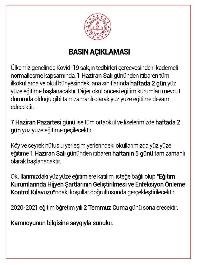 Yarın itibariyle ilkokul öğrencilerimiz, 7 Haziran Pazartesi’den itibaren ise ortaokul ve lise öğrencilerimiz için haftada iki gün yüz yüze eğitime başlıyoruz."