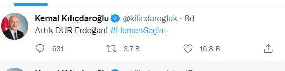 Faiz indiriminin ardından sosyal medya hesabından bir paylaşım yapan Kılıçdaroğlu, "Artık dur Erdoğan" dedi.