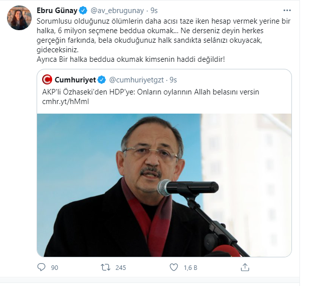 Özhaseki'nin açıklamalarına ilk ses, eli kanlı PKK'ya terör örgütü diyemeyenlerden yükseldi. HDP Sözcüsü Ebru Günay, Özhaseki'nin sözlerini bağlamından kopartarak onu hedef aldı. Günay, alçaklar tarafından şehit edilen vatandaşlarımız üzerinden Cumhurbaşkanı Erdoğan'ı hedef almayı sürdürdü: "Sorumlusu olduğunuz ölümlerin daha acısı taze iken hesap vermek yerine bir halka, 6 milyon seçmene beddua okumak. Ne derseniz deyin herkes gerçeğin farkında, bela okuduğunuz halk sandıkta selânızı okuyacak, gideceksiniz. Ayrıca Bir halka beddua okumak kimsenin haddi değildir!"