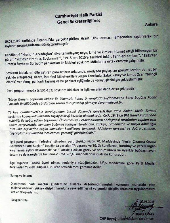 CHP Beyoğlu İlçe Başkan Yardımcısı Barış Tınay, CHP milletvekilleri Sezgin Tanrıkulu, Şafak Pavey ve Umut Oran’ın, 17 Ocak’taki Hrant Dink anmasında açılan “Yüzleşin Hrant’la, Soykırımla!” pankartının arkasında yürüdükleri gerekçesiyle disipline sevk edilmelerini istedi.
