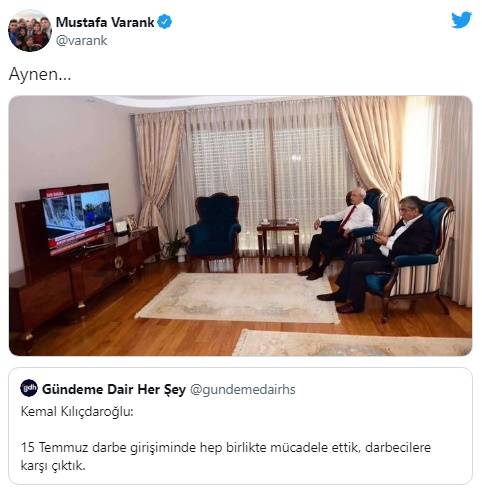 Sanayi ve Teknoloji Bakanı Mustafa Varank, Kılıçdaroğlu'nun, "15 Temmuz darbe girişiminde hep birlikte mücadele ettik, darbecilere karşı çıktık." sözlerine sosyal medya hesabı Twitter'dan tepki gösterdi.
