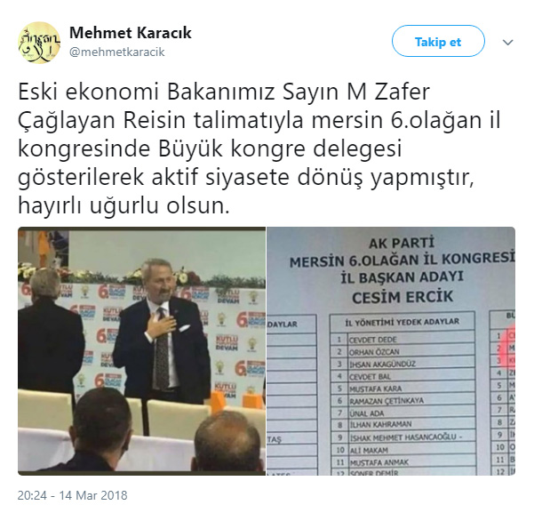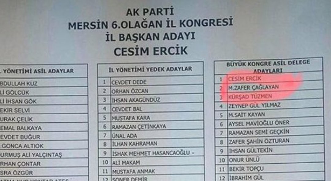 Zafer Çağlayan geçen hafta sonu yapılan AK Parti Mersin 6. Olağan İl Kongresi'nde 19 kişilik büyük kongre delege listesinde yer aldı.