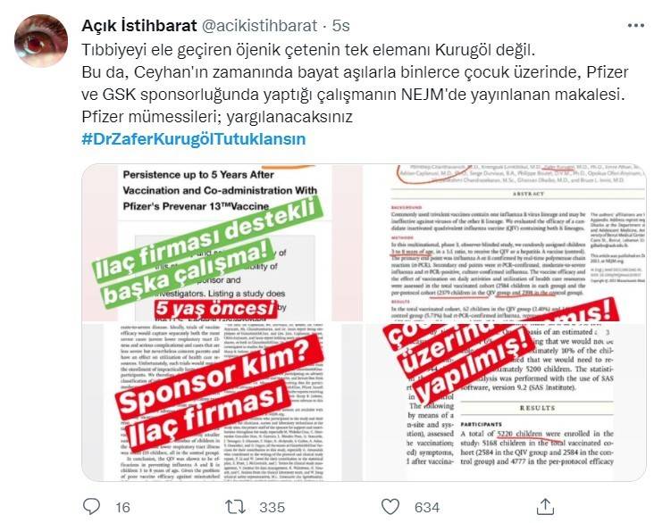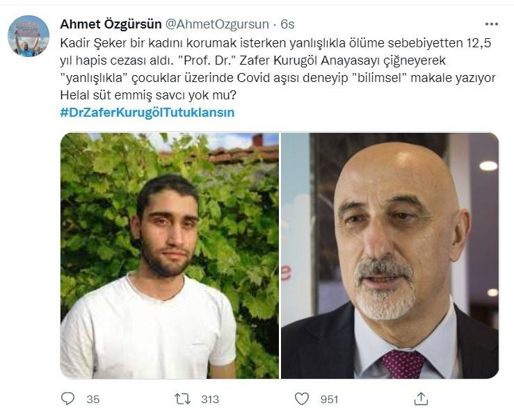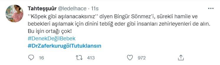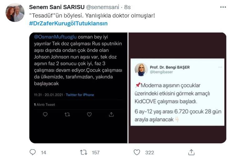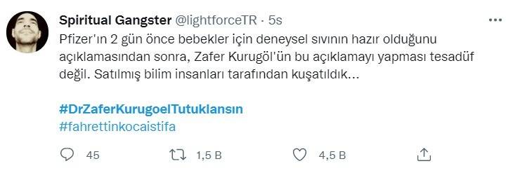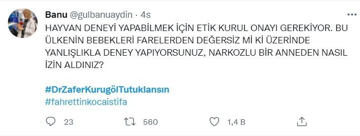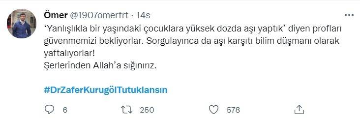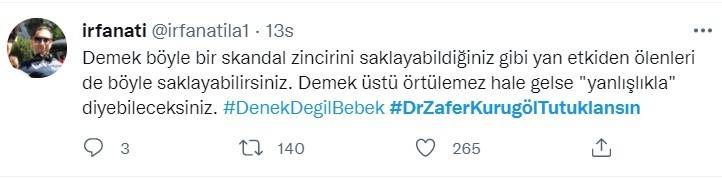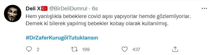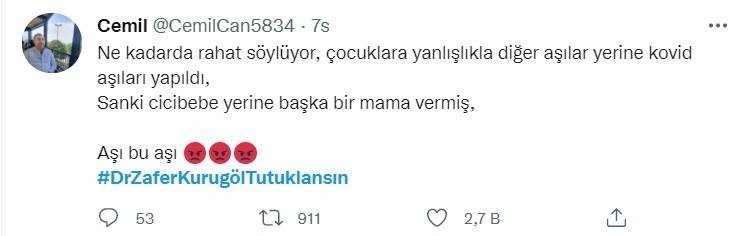 Prof. Dr. Zafer Kurugöl, bebeklere yanlışlıkla korona aşısı yapıldığını ve bu deneyin ardından bir tıp bilimsel makale hazırlayacaklarını itiraf etmesinin ardından vatandaşlardan büyük tepki aldı. Sosyal medyada tepki gösteren vatandaşlar Kurugöl'ün tutuklanmasını istedi. Vatandaşların Twitter'da tepkilerini dile getirdiği #DrZaferKurugölTutuklansın etiketi Türkiye gündemi listesinde yer alırken etikete on binlerce tweet atıldı.