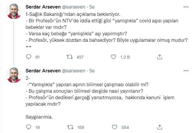 “Zaman zaman yanlışlıkla bazı durumlar oluyor. Mesela başka bir aşıyla, hepatit b aşısıyla, kızamık aşıyla karıştırabiliyorlar sağlık ocaklarında. Küçük çocuklara Covid aşısı yapıldığı oluyor. Biz böyle vakalarla karşılaştık. Sizi temin ederim hiçbir yan etki olmadı bu kişilerde. Ve son derece iyi antikor oldu. 6 aylık bebekte, 1 aylık bebekte bile çok iyi şeyler oldu. Bunları da yayınlayacağız yakın zaman içinde çok ünlü bir tıp dergisinde… Küçük bebeklerde yüksek doz verseniz bile yan etkisi açısından bir sıkıntı olmuyor.”