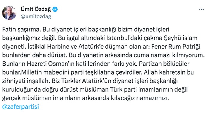 Zafer Partisi Genel Başkanı Ümit Özdağ, Diyanet İşleri Başkanlığı’nın yayınladığı “Cumhuriyet konulu Cuma Hutbesi”ni hedef alarak skandal açıklamalarda bulundu. Özdağ, twitter hesabından yaptığı açıklamada Fener Rumpartiği’nin Diyanet’ten daha dürüst olduğunu idida etti. Diyanet İşleri Başkanlığı’nın ise kendi Diyanet İşleri Başkanlığı olmadığını ifade ederek, “Bu diyanetin arkasında cuma namazı kılmıyorum” dedi.