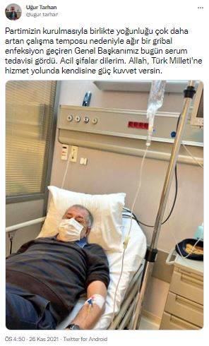 Partimizin kurulmasıyla birlikte yoğunluğu çok daha artan çalışma temposu nedeniyle ağır bir gribal enfeksiyon geçiren Genel Başkanımız bugün serum tedavisi gördü. Acil şifalar dilerim. Allah, Türk Milleti'ne hizmet yolunda kendisine güç kuvvet versin.