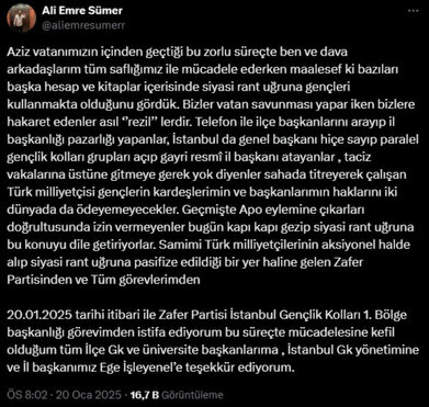 Sümer paylaşımının devamında bugün (20 Ocak) itibariyle Zafer Partisi İstanbul Gençlik Kolları 1. Bölge başkanlığı görevinden istifa ettiğini belirtti.