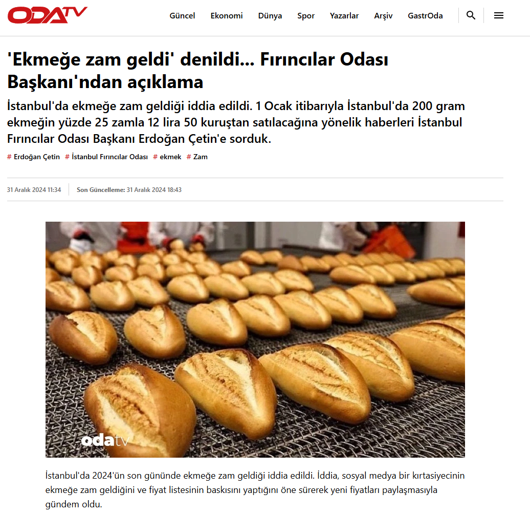 T24 ve Odatv’nin yaptığı halkın ekmeğine zam yapılacağı haberleri, kamuoyunda büyük tartışmaya neden oldu. Odatv’nin İstanbul Fırıncılar Odası Başkanı Erdoğan Çetin’e yönelttiği soruya “zam yok” yanıtı verilmesine rağmen, T24 “zam var” açıklamasıyla haber yaptı. Odatv, ikinci kez aynı soruyu sorarak bir kez daha “zam yok” cevabını aldı.