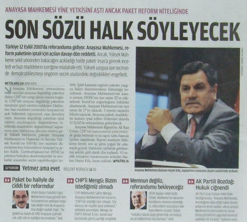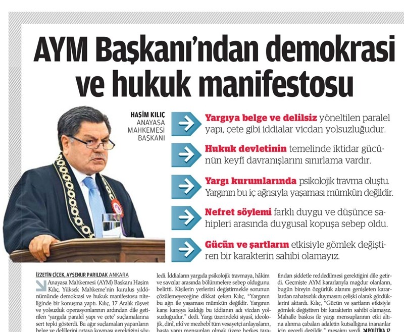 Aynı Zaman gazetesi, 26 Nisan'daki 1. sayfasında demokrasi paketinin içeriğine müdahale eden Anayasa Mahkemesi Başkanı Kılıç'ın hukukçu kimliği ile yaptığı siyasi içerikli konuşmayı "demokrasi ve hukuk manifostosu" diye okuyucularına sundu.