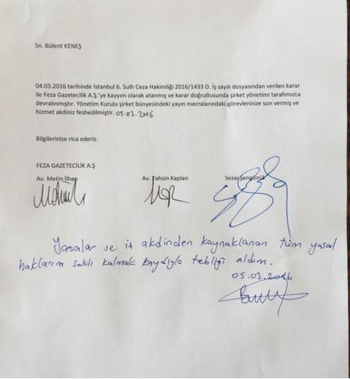 Zaman Gazetesi Genel Yayın Müdürü Abdulhamit Bilici'nin görevden alınmasının ardından Zaman yazarı Bülent Keneş'in de yazılarına son verildi. Keneş iş akdinin sonlandırılışını Twitter adresinden şu şekilde duyurdu.