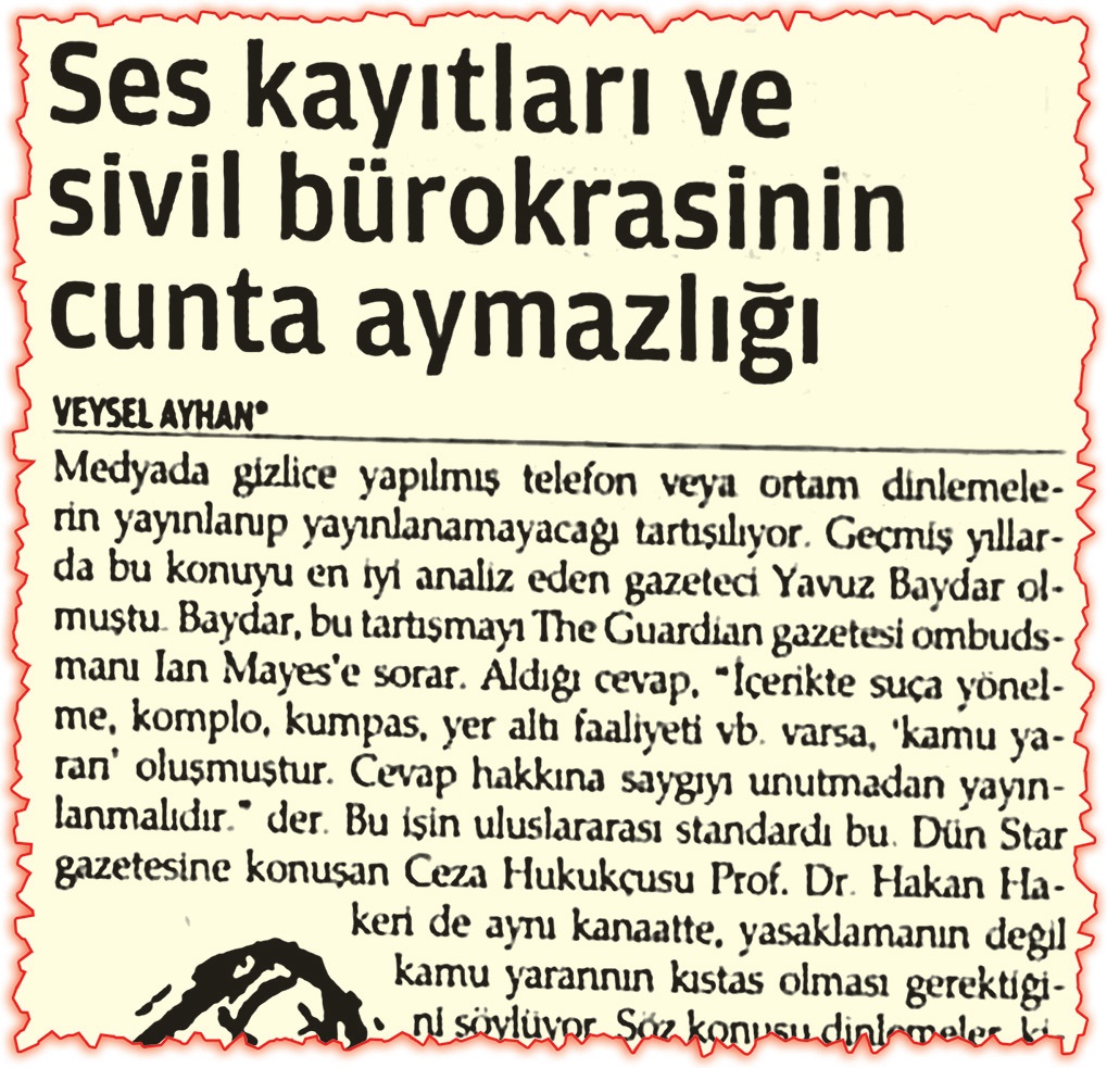 Veysel Ayhan, “Ses kayıtları ve sivil bürokrasinin cunta aymazlığı” başlıklı yazısında; “Medyada gizlice yapılmış telefon veya ortam dinlemelerin yayınlanıp yayınlanamayacağı tartışılıyor. Geçmiş yıllarda bu konuyu en iyi analiz eden gazeteci Yavuz Baydar olmuştu. Baydar, bu tartışmayı The Guardian gazetesi ombudsmanı Ian Mayes’e sorar. Aldığı cevap, “İçerikte suça yönelme, komplo, kumpas, yer altı faaliyeti vb. varsa, ‘kamu yararı’ oluşmuştur. Cevap hakkına saygıyı unutmadan yayınlanmalıdır” ifadelerini kullanmıştı.