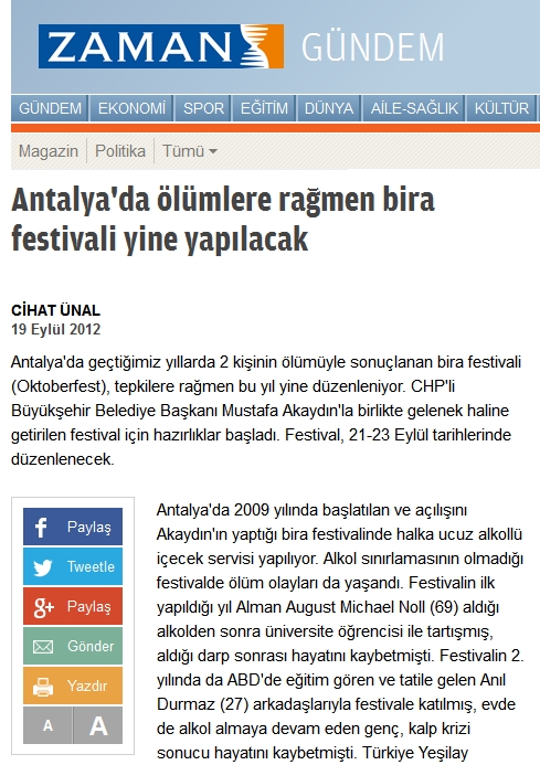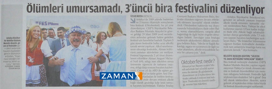İşte Zaman'ın, CHP'li Antalya Büyükşehir Belediyesi'nin en büyük hizmeti (!) olan bira festivaliyle ilgili olarak Akaydın'ı eleştirdiği haberlerden bazıları;