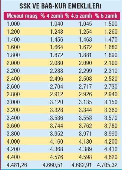 Hazırlanan tabloya bakan emekliler, bu tahminlere göre yeni maaşları hakkında bilgi sahibi olabilecek. Halen en düşük emekli aylığı 935,60 lira seviyesinde bulunuyor. Bu maaş yüzde 4'lük tahmine göre 973,02, yüzde 4.5'lik tahmine göre 977,70, yüzde 5'lik tahmine göre de 982,38 liraya çıkacak. Takvim'deki habere göre, halen SSK ve Bağ- Kur emeklilerinde en yüksek maaş ise 4 bin 481 lira 26 kuruş seviyesinde bulunuyor. Eğer zam yüzde 4 olarak gerçekleşirse, bu maaş 179,25 lira artışla 4 bin 660 lira 51 kuruşa çıkacak. Zam oranının yüzde 4.5 olması halinde ise en yüksek emekli maaşı 201,65 lira artacak. Temmuz zammı yüzde 5 olursa da 4 bin 481 lira 26 kuruşluk en yüksek maaş, 224,06 lira artışla 4 bin 705 lira 32 kuruş olacak.