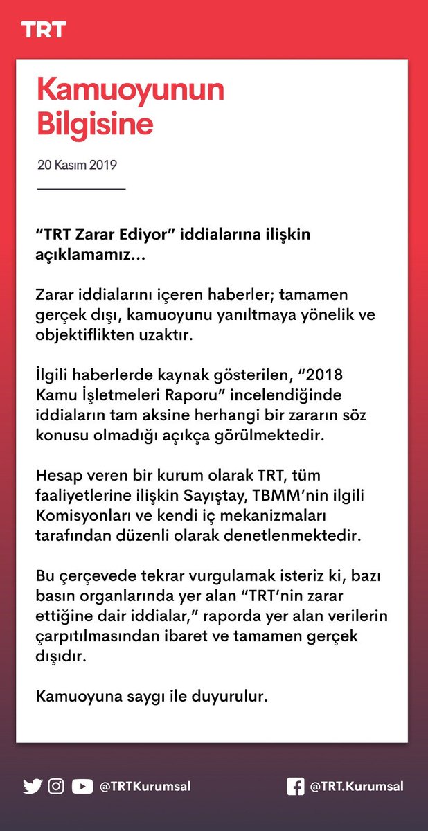 "Zarar iddialarını içeren haberler; tamamen gerçek dışı, kamuoyunu yanıltmaya yönelik ve objektiflikten uzaktır. İlgili haberlerde kaynak gösterilen, '2018 Kamu İşletmeleri Raporu' incelendiğinde iddiaların tam aksine herhangi bir zararın söz konusu olmadığı açıkça görülmektedir. Hesap veren bir kurum olarak TRT, tüm faaliyetlerine ilişkin Sayıştay, TBMM’nin ilgili Komisyonları ve kendi iç mekanizmaları tarafından düzenli olarak denetlenmektedir. Bu çerçevede tekrar vurgulamak isteriz ki, bazı basın organlarında yer alan 'TRT'nin zarar ettiğine dair iddialar,' raporda yer alan verilerin çarpıtılmasından ibaret ve tamamen gerçek dışıdır."