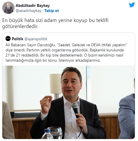 Babacan, "Sayın Davutoğlu, 'Saadet, Gelecek ve DEVA ittifak yapalım' diye önerdi. Partinin yetkili organlarına götürdük. Başkanlık kurulunda 21'de 21 reddedildi. Bir kişi bile desteklemedi. O bizim kendimizi nasıl tanımladığımızla ilgili bir konu. İstemiyor arkadaşlarımız" açıklamasını yapmıştı.