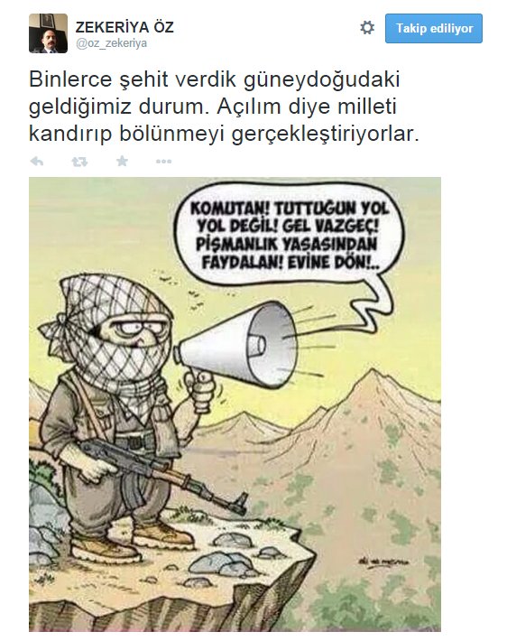 Zekeriya Öz, "Binlerce şehit verdik güneydoğudaki geldiğimiz durum. Açılım diye milleti kandırıp bölünmeyi gerçekleştiriyorlar" diye de yazarak kendince hükümeti eleştirdi.Fakat karikatürün orijinal halinin çözüm süreciyel alakası yok. 11 Ocak 2012'de yayımlanan söz konusu karikatürde Türk Silahlı Kuvvetleri'nin bir numarası olan Genelkurmay Başkanı İlker Başbuğ'un 'terör örgütü yönetecisi olma' suçlamasıyla tutuklanması bir PKK'lının gözünden anlatılıyor.