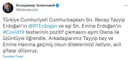 Ukrayna Devlet Başkanı Vladimir Zelenskiy, koronavirüs testi pozitif çıkan Başkan Recep Tayyip Erdoğan ve eşi Emine Erdoğan'a acil şifalar diledi.