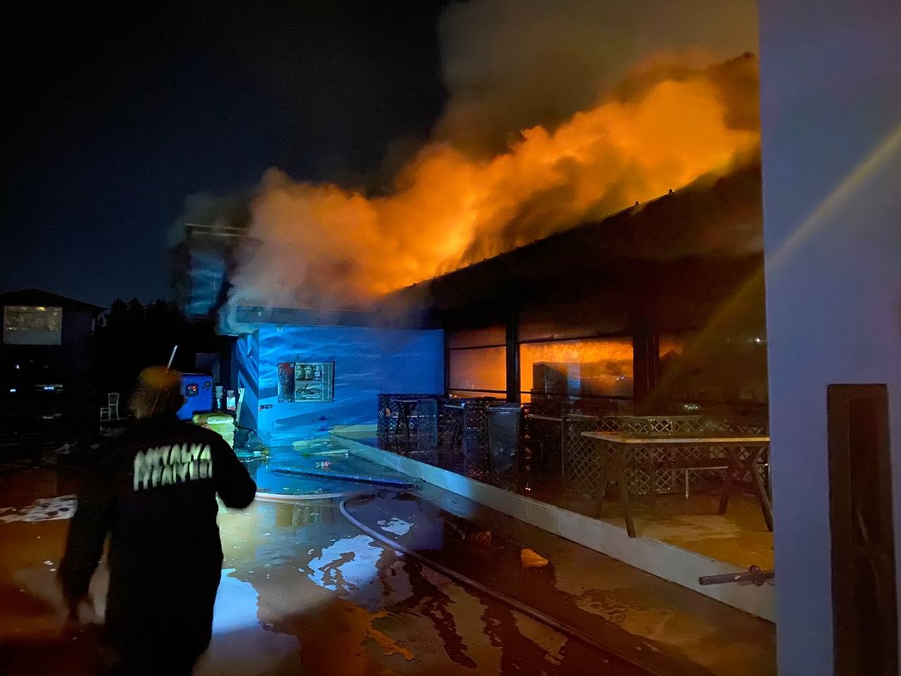 Yangın nedeniyle markette hasar oluştu, 2 çam ağacı zarar gördü.