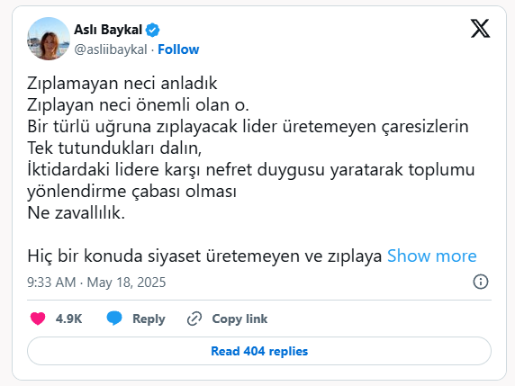Muhaliflerin "Zıpla, zıpla, zıplamayan Tayyipçi" sloganını tiye alan CHP eski Genel Başkanı Deniz Baykal'ın kızı Prof. Dr. Aslı Baykal, muhalefetin sloganına eleştirilerde bulundu. Muhalefetin siyaset üretmek yerine Erdoğan düşmanlığıyla prim yapmaya çalıştığını söyleyen Aslı Baykal, sosyal medya hesabından şu ifadelerde bulundu: