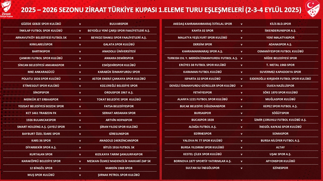 Ziraat Türkiye Kupası 1. Eleme Turu kura çekimi Riva’da gerçekleştirildi. 155 takımın katıldığı tur maçları 2-4 Eylül tarihleri arasında oynanacak. TFF yetkilileri, kupanın heyecanını artırmak için formatta değişiklik yaptıklarını açıkladı. Kupada sürprizler ve Avrupa biletleri heyecanla bekleniyor. İşte eşleşmeler: