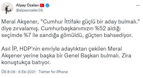 Akşener'in bu sözlerine AK Parti İzmir Milletvekili Alpay Özalan'dan tepki gecikmedi. Alpay Özalan sosyal medya hesabından yaptığı paylaşımda, "Asıl İP, HDP'nin emriyle adaylıktan çekilen Meral Akşener yerine başka bir Genel Başkan bulmalı. Zira konuştukça batıyor." ifadelerini kullandı.