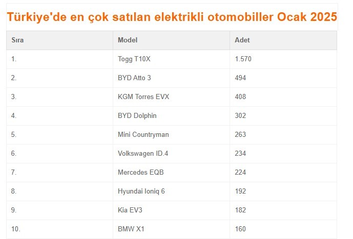 Diğer yandan KGM Torres EVX ve Mini Countryman'in geçen yıl gösterdiği performansı devam ettirerek 2025'in ilk ayında da üst sıralarda yer aldıklarını görmekteyiz. Tesla ise ocak ayına ilişkin bir açıklamada bulunmadığı için listede yer almıyor.