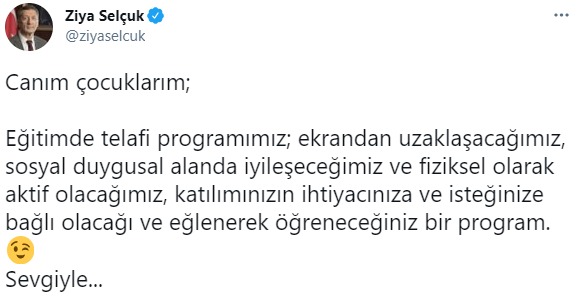 Selçuk sosyal medya hesabından yaptığı paylaşımda, “Canım çocuklarım; Eğitimde telafi programımız; ekrandan uzaklaşacağımız, sosyal duygusal alanda iyileşeceğimiz ve fiziksel olarak aktif olacağımız, katılımınızın ihtiyacınıza ve isteğinize bağlı olacağı ve eğlenerek öğreneceğiniz bir program. Sevgiyle...” ifadelerini kullandı.