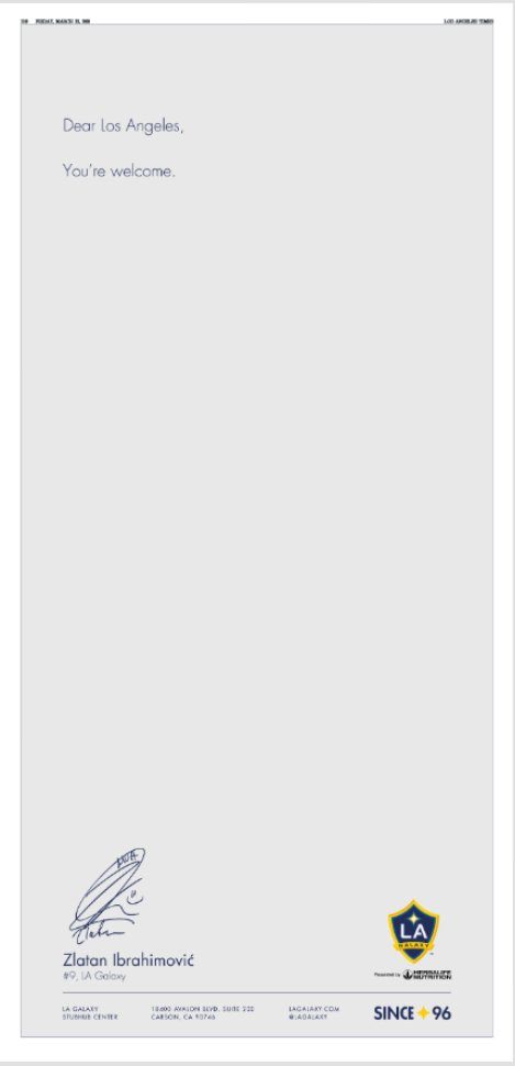 Kariyerini ABD'nin Los Angeles Galaxy takımında sürdürmesi beklenen Zlatan Ibrahimovic, kentin prestijli gazetelerinden Los Angeles Times'a verdiği tam sayfa reklam ile iddiaları güçlendirdi.