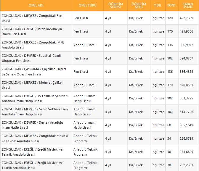 Zonguldak liseleri taban puanı 2021, Zonguldak liseleri başarı sıralaması ve liseleri kontenjanları nelerdir?