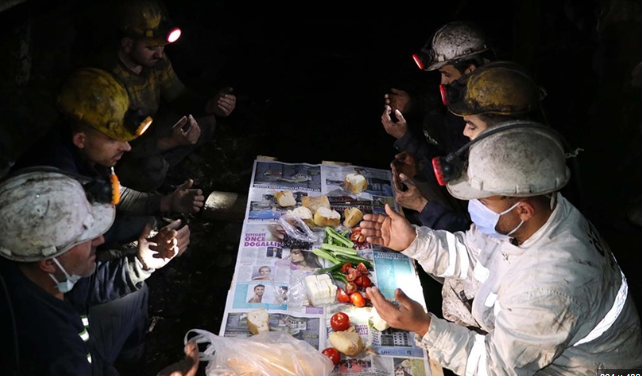 Baretlerinin ışığının aydınlattığı ocak içinde ilk sahurlarını yapmanın heyecanını yaşayan maden işçileri, yanlarında getirdikleri domates, salatalık, soğan, biber, peynir, zeytin, konserve ve ekmeği kömürden kararmış elleriyle yedi.