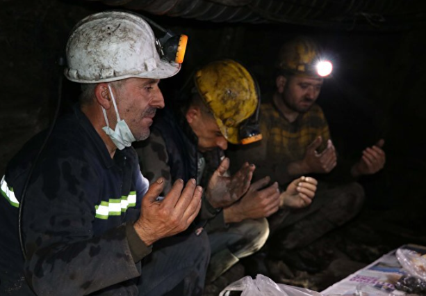 Ailelerinden uzak ilk sahurlarını yerin 200 metre altında yapan işçiler, ezan vaktinin gelmesiyle oruca niyetlenerek dua etti.