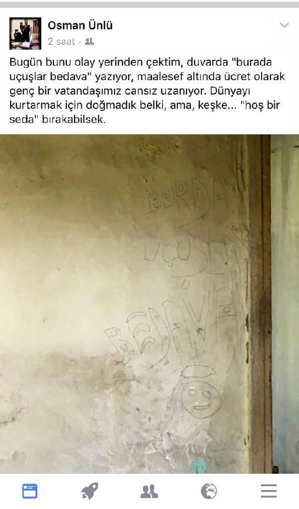 Kentte bir otoparkta çalışan Aşkın Bilge, Mithatpaşa Mahallesi Rüzgarlımeşe Sokak'taki harabe binada ölü bulundu. Bilge'nin sentetik uyuşturucu bonzai kullanması sonucu öldüğü ön inceleme raporunda belirtildi. Cesedin bulunduğu binada inceleme yapan Cumhuriyet Savcısı Osman Ünlü, duvardaki "Burada uçuşlar bedava' yazısını fotoğraflayıp sosyal medya hesabında paylaştı. Savcı Ünlü, fotoğrafın altına, "Bugün bunu olay yerinden çektim. Duvarda 'Burada uçuşlar bedava' yazıyor. Maalesef altında ücret olarak genç bir vatandaşımız cansız uzanıyor. Dünyayı kurtarmak için doğmadık belki ama keşke...'hoş bir seda' bırakabilsek" notunu yazdı.