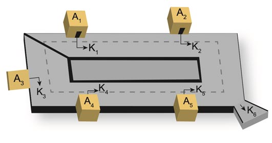 Yukarıdaki şekil bir hapishanenin (K1, K2, K3, K4, K5, K6) koridorlarını, (A1, A2, A3, A4, A5) koğuşlarını göstermektedir.