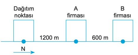 Yukarıda gösterildiği gibi, aynı yol üzerinde bulunan dağıtım noktası ile A firması ile aralarındaki uzaklık 1200 m A ve B firmaları arasındaki uzaklık 600 m'dir.
