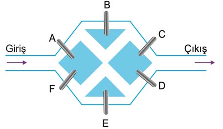 Yukarıda, bir bölgedeki ekili alanları sulamak için yapılmış sulama kanalları sisteminin bir şeması verilmiştir. A, B, C, D, E ve F kapakları gerek duyulan yerlere suyu akıtmak için açılıp kapanabilmektedir. Bir kapak kapalıysa oradan su geçemez.