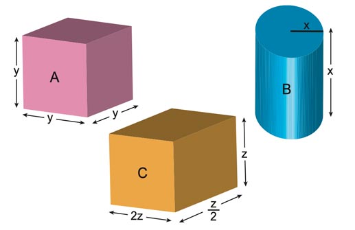 A, B ve C katı cisimlerinin hacimleri eşit olduğuna göre x, y, z arasındaki doğru sıralama aşağıdakilerden hangisidir? (π = 3 alınız)