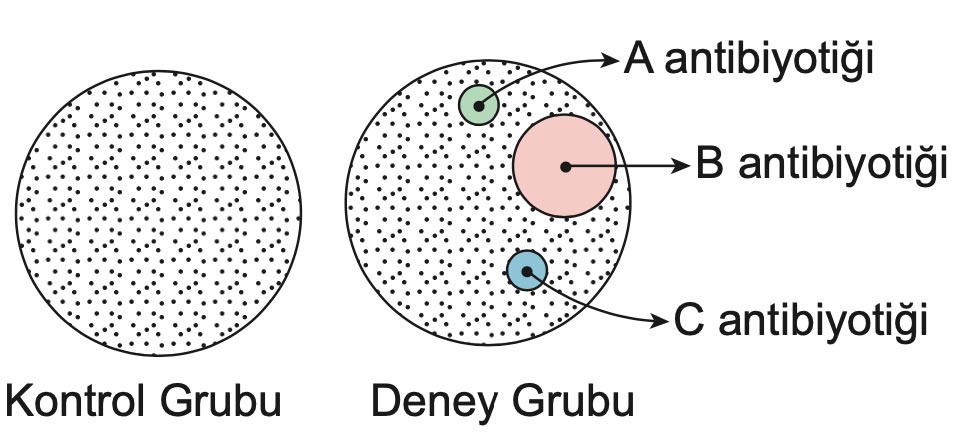 Deney Grubu: Antibiyotik disklerinin çeşitlerine göre bakteri üremesi engellenmiştir.