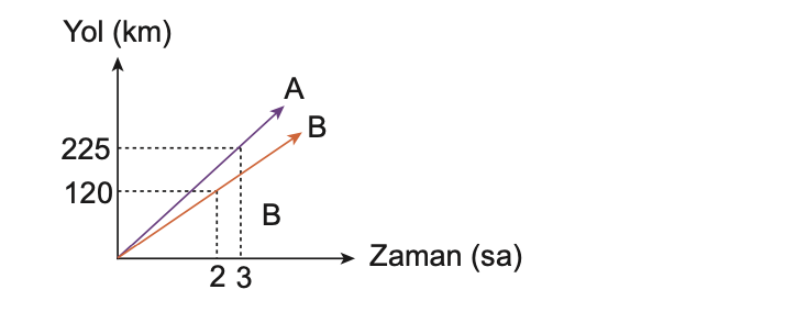 Yukarıda grafik A ve B araçlarının zamana göre aldıkları yolları göstermektedir.
