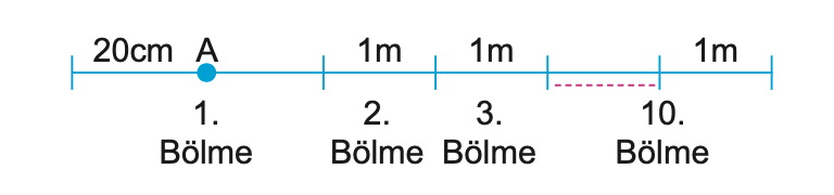10 metrelik bir yol, 1'er metrelik bölümlere ayrılmıştır. Bir kurbağa ilk bölmenin 20. santimetresinde (A) bulunmaktadır ve kurbağa bir sıçramada 30 cm zıplayabilmektedir. Bu kurbağa zıplayarak bu yolu bitirmiştir.