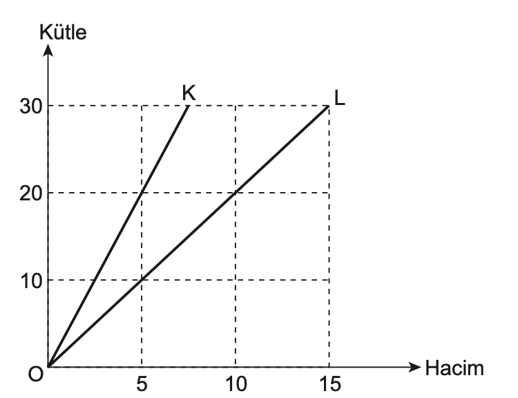 Tabanında 100 cm3 su bulunan kap üzerine şekildeki grafikte gösterilen K ve L sıvılarından sırasıyla 50 g ve 30 cm3 konuluyor.