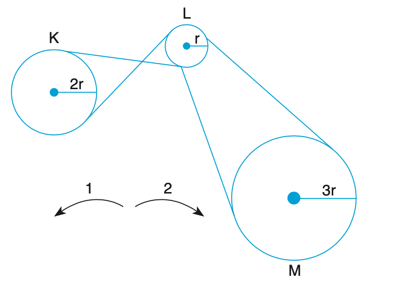 Şekilde gösterilen K, L, M çarkları birbirine bağımlı şekilde hareket etmektedir.