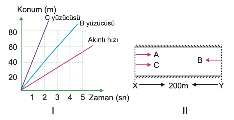 Şekildeki I nolu grafikte B ve C yüzücülerinin hızı ile akıntı hızı gösterilmiştir. II nolu şekilde ise akıntı hız yönü (A), B ve C yüzücülerinin ise başlangıç konumları gösterilmiştir. X – Y mesafesi 200m olarak belirtilmiştir.