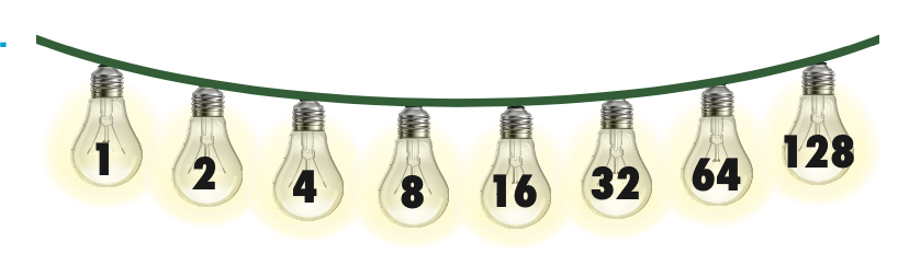 Yukarıdaki elektrik kablosunda asılan 8 lambadan her birinin üzerine 1, 2, 4, 8, 16, 32, 64, 128 sayıları yazılmıştır.