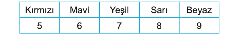 Aşağıdaki tabloda kırmızı, mavi, yeşil, sarı, beyaz renkli lambaların kaç kez yandığı verilmiştir.