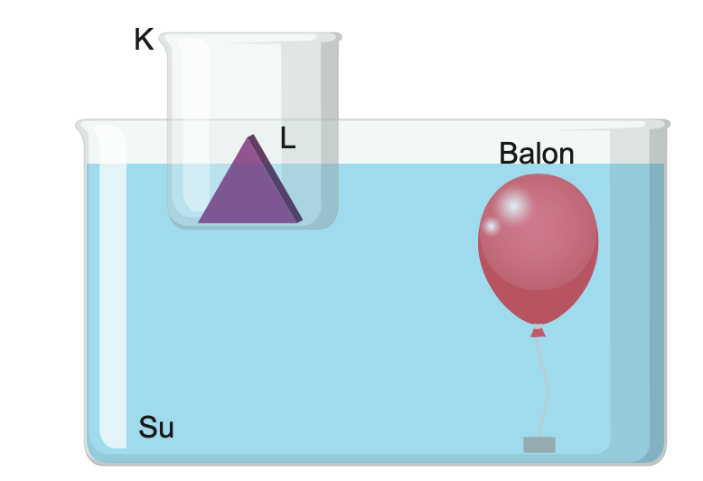 İçi boş K kabının içinde bulunan L cismi ve esnek balon şekildeki gibi suda dengededir. Bir süre sonra L cismi suyun içine bırakılınca balon ve bağlı olduğu cisim yukarı doğru hareket ediyor.