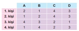 Bir kağıda 1, 2, 3 ve 4 rakamları birer kez kullanılarak oluşturulan dört basamaklı bir ABCD doğal sayısı yazılıyor. Bu sayıyı bulmak isteyen dört kişinin yaptığı tahminler yukarıda verilmiştir. İkinci kişi bu sayının sadece B rakamını bilmiş diğer 3 kişi ise hiçbir rakamını bilememiştir.